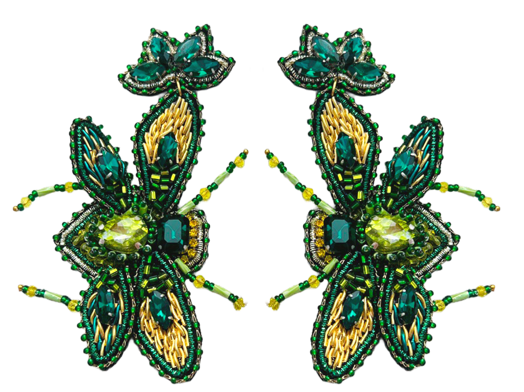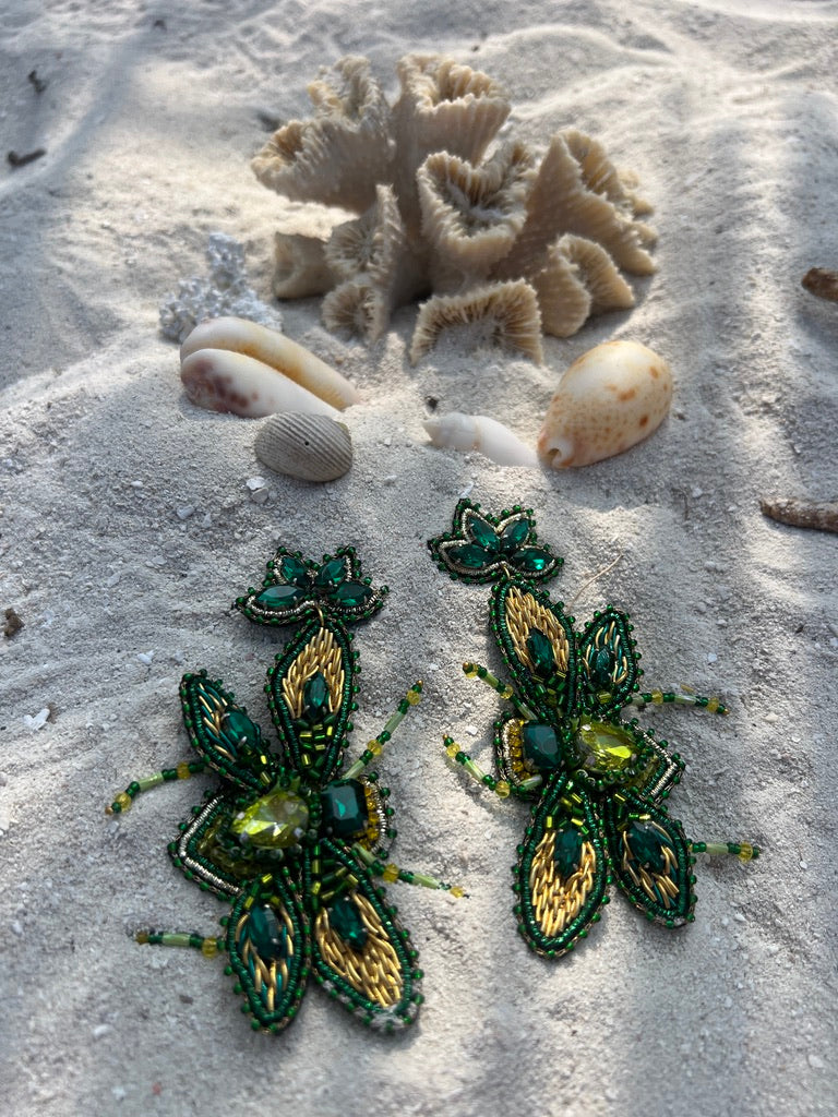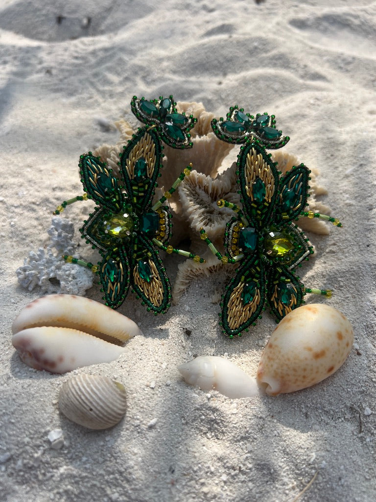 Diese auffälligen Ohrringe in Käferform sind ein echter Blickfang und verbinden handwerkliche Kunst mit einem Hauch Extravaganz. Sorgfältig aus vielen kleinen grünen Perlen gefertigt, entsteht ein detailreiches Design, das die Schönheit der Natur in stilvoller Form widerspiegelt.