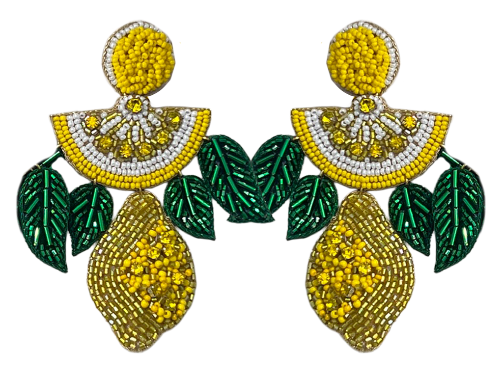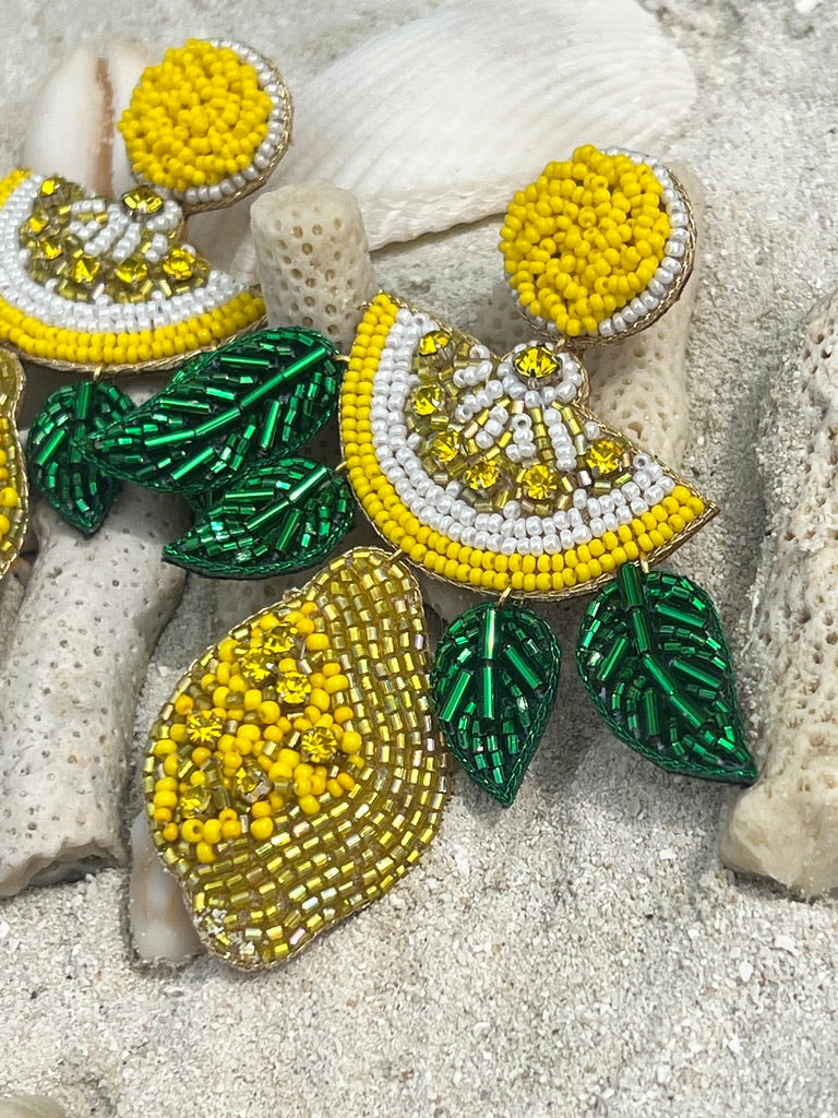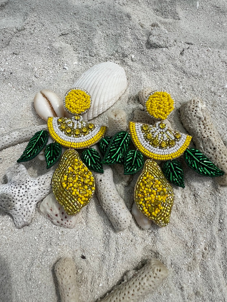 Diese detailreich gearbeiteten Ohrringe in Zitronenform bestehen aus vielen kleinen gelben und grünen Perlen und vereinen Frische mit eleganter Leichtigkeit. Das klare Design mit den leuchtenden Farben macht sie zu einem stilvollen Accessoire, das sich wunderbar sowohl im Alltag als auch zu besonderen Anlässen tragen lässt.